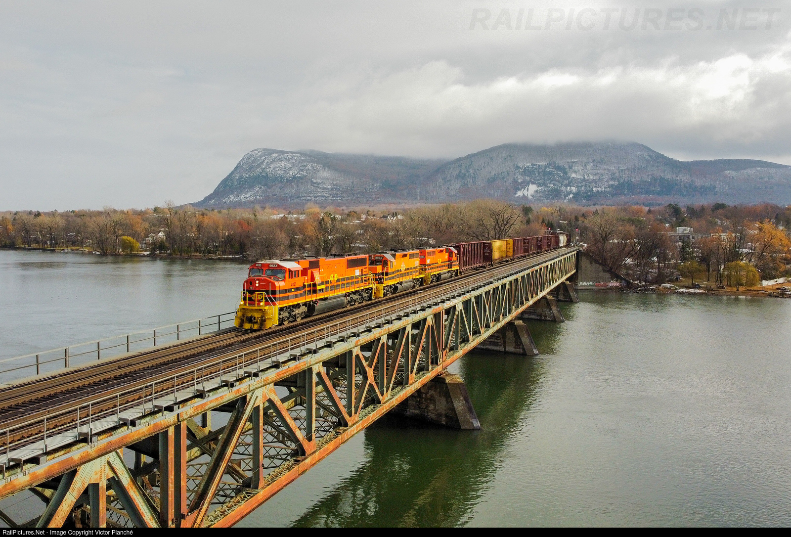 Coming from Richmond, Saint-Lawrence & Atlantic train 520 crosses the Richelieu River at Belœil enrolee to Southwark, with the Mont-Saint-Hilaire hidden by fog in the background. SLR SD70MAC 4023 (ex-BNSF 8982) is leading the train towards CN's Southwark yard.