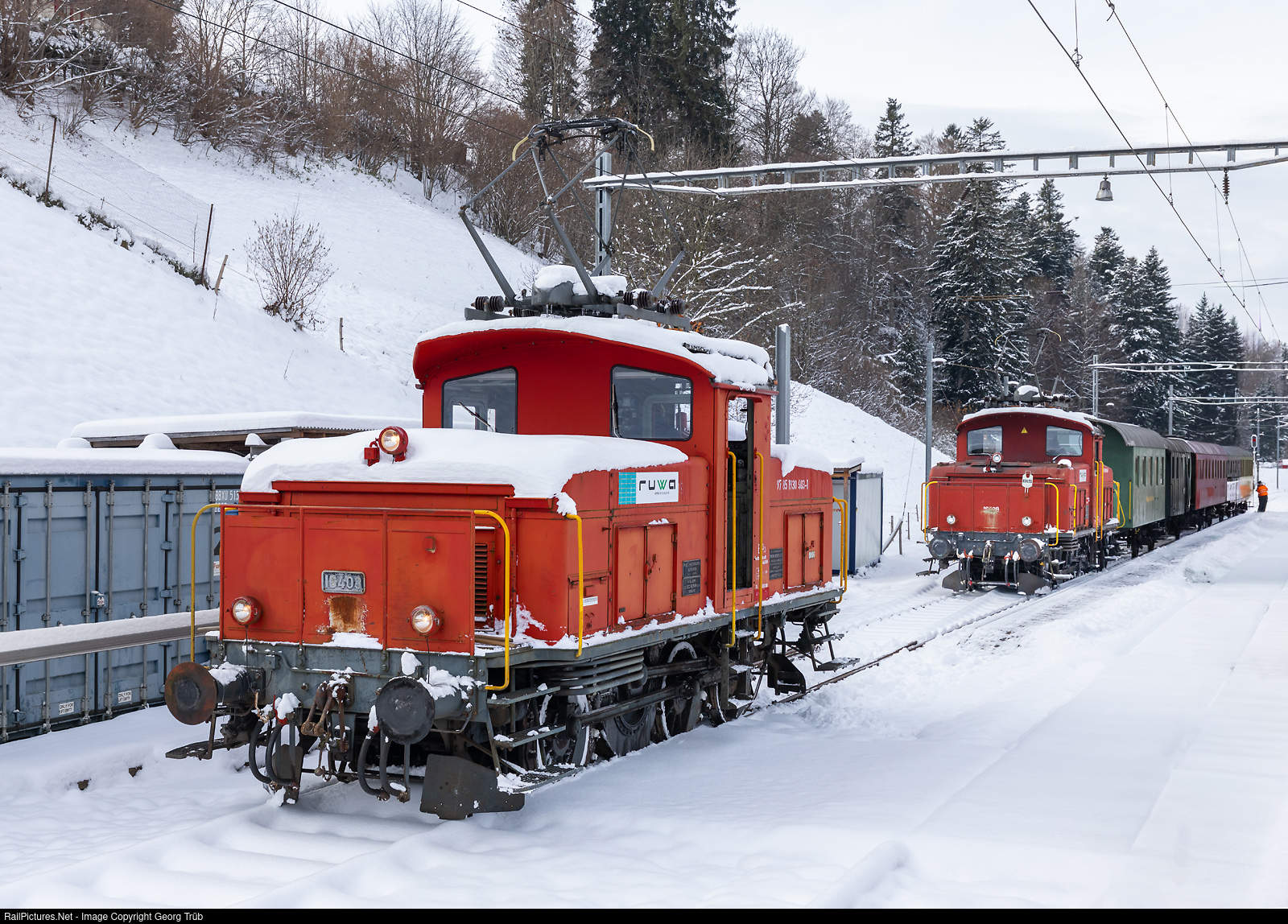 More than 10 years ago, the RUWA wire welding plant in Sumiswald took over the two Ee 3/3 electric shunting locomotives "pocket crocodiles" # 16403 and # 16408 (built 1946) from SBB in order to deliver freight cars from Sumiswald-Grünen station to the plant premises (approx. 2 kilometers) using its own resources. On November 23, 2025, the Railway Touring Company from Great Britain, together with the Bern Steam Railway Association (DBB), organized a trip with a passenger train and the two Ee 3/3 locomotives along the entire route of the Emmentalbahn from Sumiswald-Grünen to Wasen im Emmental (5.2 kilometers). Due to snow and ice, the track had to be cleared at various level crossings and the train had to be driven very carefully. The unique train reached Wasen im Emmental station shortly, end of the line. Ee 3/3 # 16403 was uncoupled and moved some meters forward. Ee 3/3 # 16408 will push back the cars some meters, so that # 16403 can move in the goaround track. Then # 16408 will pull the cars forward again towards the buffer stop.