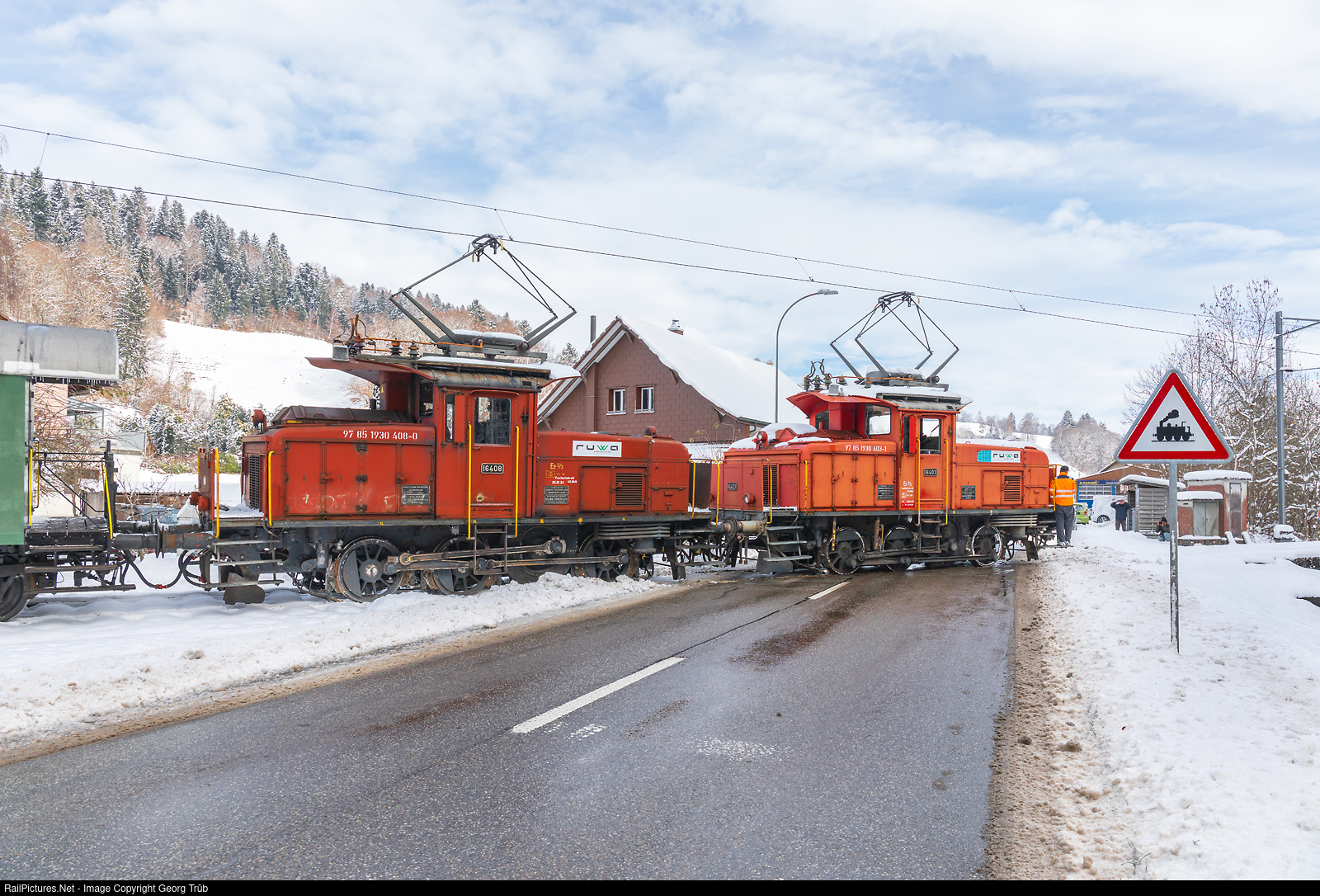 More than 10 years ago, the RUWA wire welding plant in Sumiswald took over the two Ee 3/3 electric shunting locomotives "pocket crocodiles" # 16403 and # 16408 (built 1946) from SBB in order to deliver freight cars from Sumiswald-Grünen station to the plant premises (approx. 2 kilometers) using its own resources. On November 23, 2025, the Railway Touring Company from Great Britain, together with the Bern Steam Railway Association (DBB), organized a trip with a passenger train and the two Ee 3/3 locomotives along the entire route of the Emmentalbahn from Sumiswald-Grünen to Wasen im Emmental (5.2 kilometers). Due to snow and ice, the track had to be cleared at various level crossings and the train had to be driven very carefully. The unique train with Ee 3/3 # 16403 and # 16408 is slowly crossing the Bahnhofstrasse (main road) before entering Wasen im Emmental station.