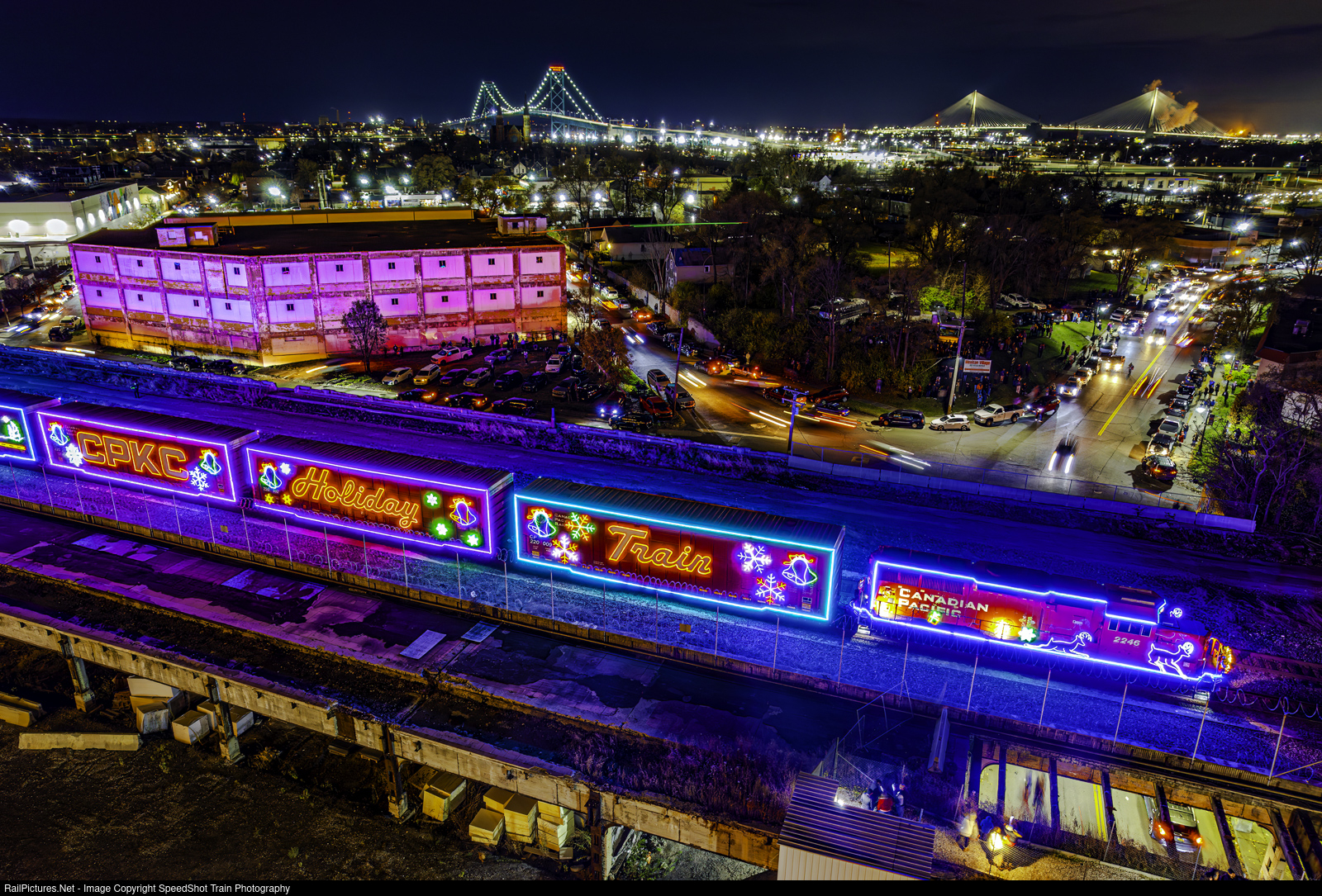 | CPKC Holiday Train 2025 rolls out of the tunnel from Canada and in to Detroit. Here they roll Westbound in Downtown Detroit with both the old and new bridge to Canada in the background |