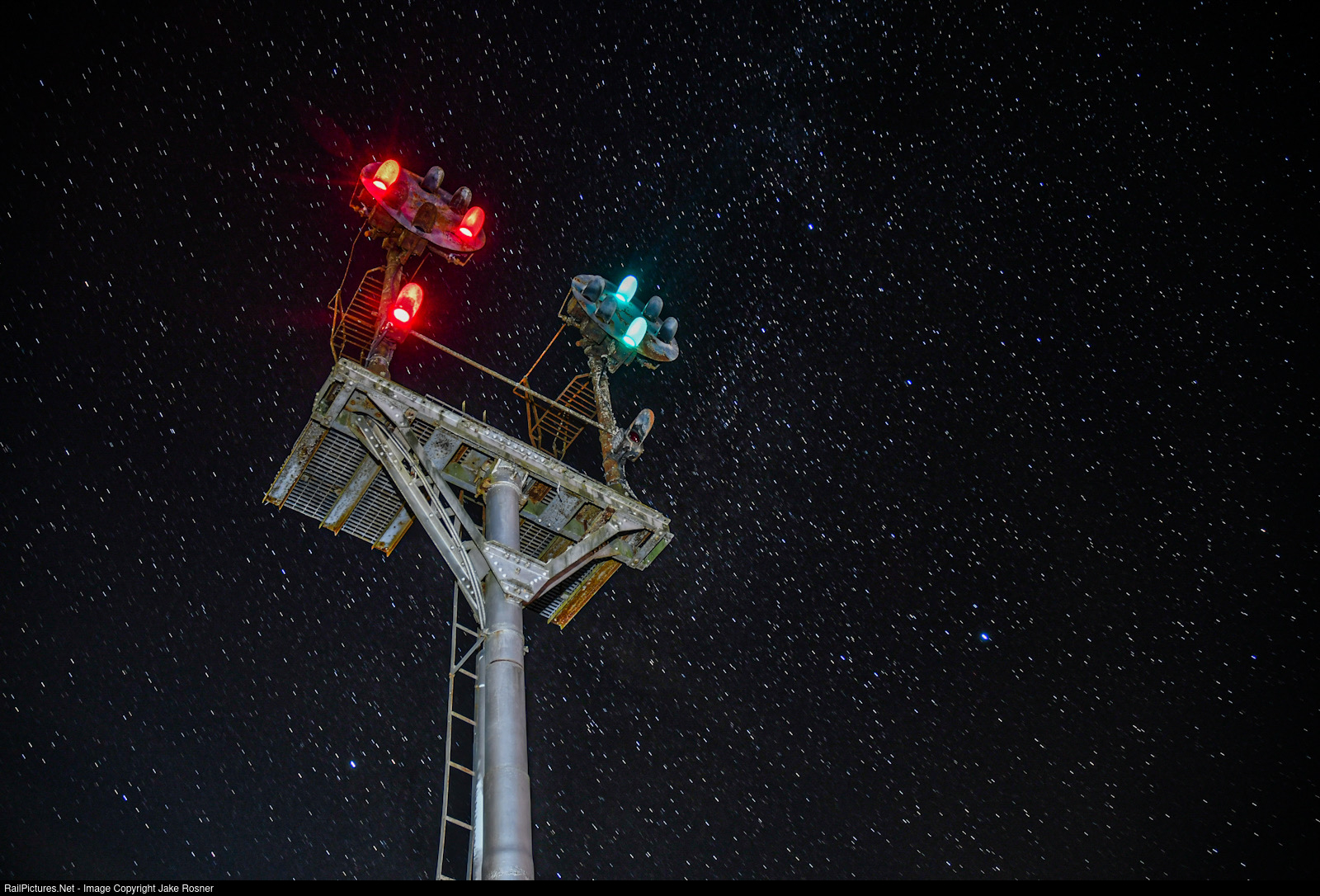 | Under a clear night sky, the former Norfolk and Western CPL (Color Position Lights) mast in Lithia Virginia shine a bright green for the oncoming southbound NS 15T, one of only 4 daily trains that run the valley line. |