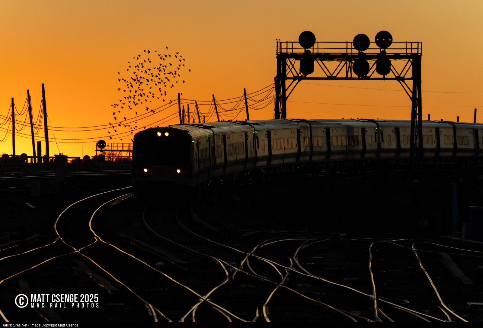 The recently set sun turns the cloudless sky bright orange as Long Island Rail Road (LIRR) train 892 rounds the curve west of Jamaica Station on its way to Long Beach. |
