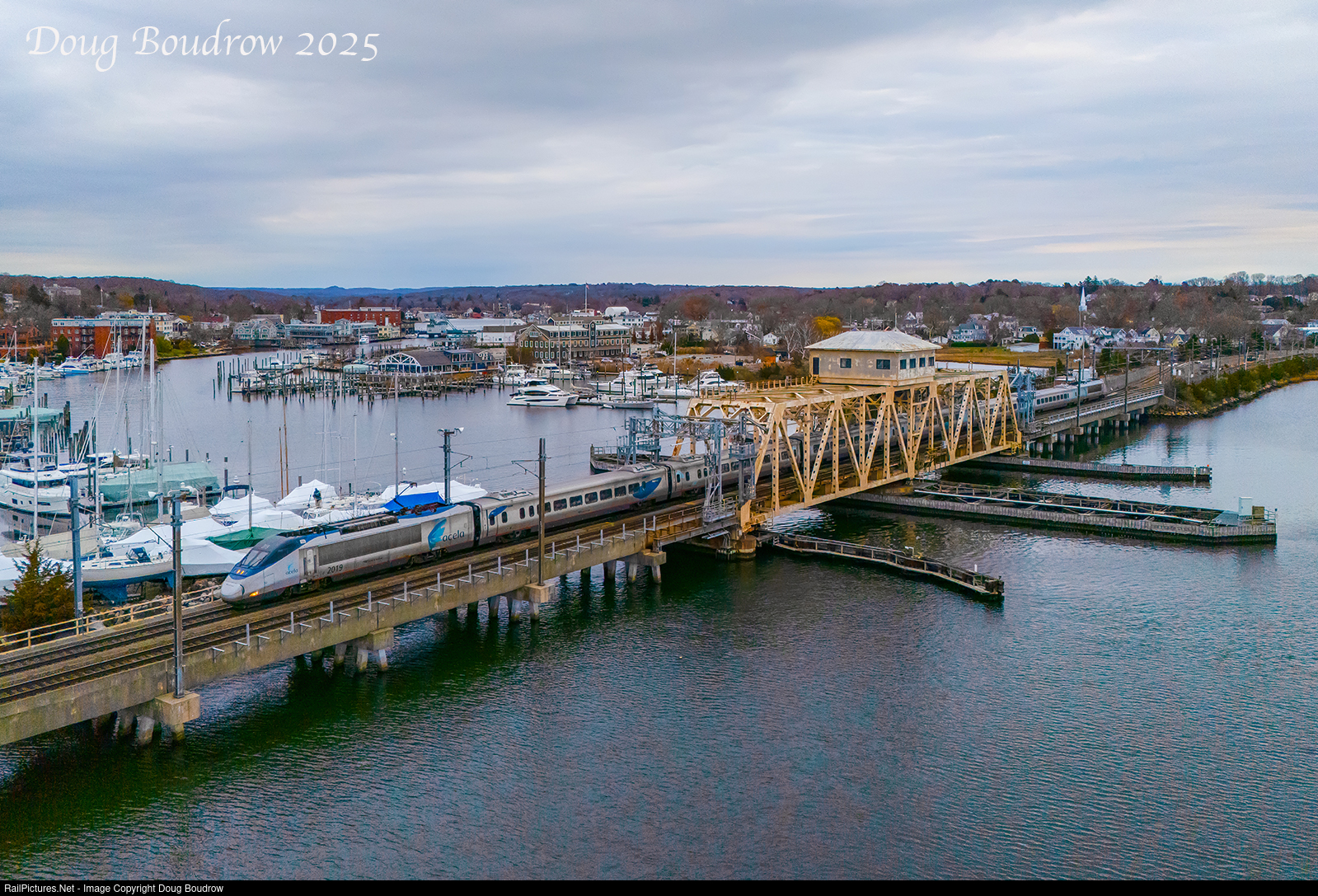 Amtrak Acela 2255 is seen crossing the Mystic River at track speed en route for New York and eventually Washington DC.