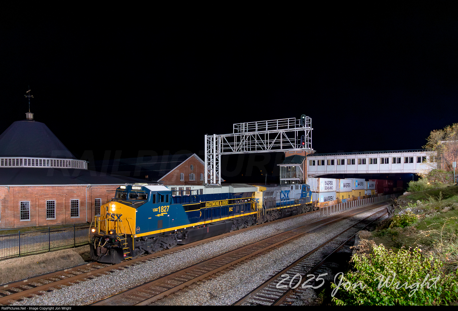 CSX intermodal I135 from Portsmouth, VA passes by the 1866 built B&O Roundhouse and Shop Complex at Martinsburg, WV with CSXT 1827 leading on the evening of November 24, 2025.