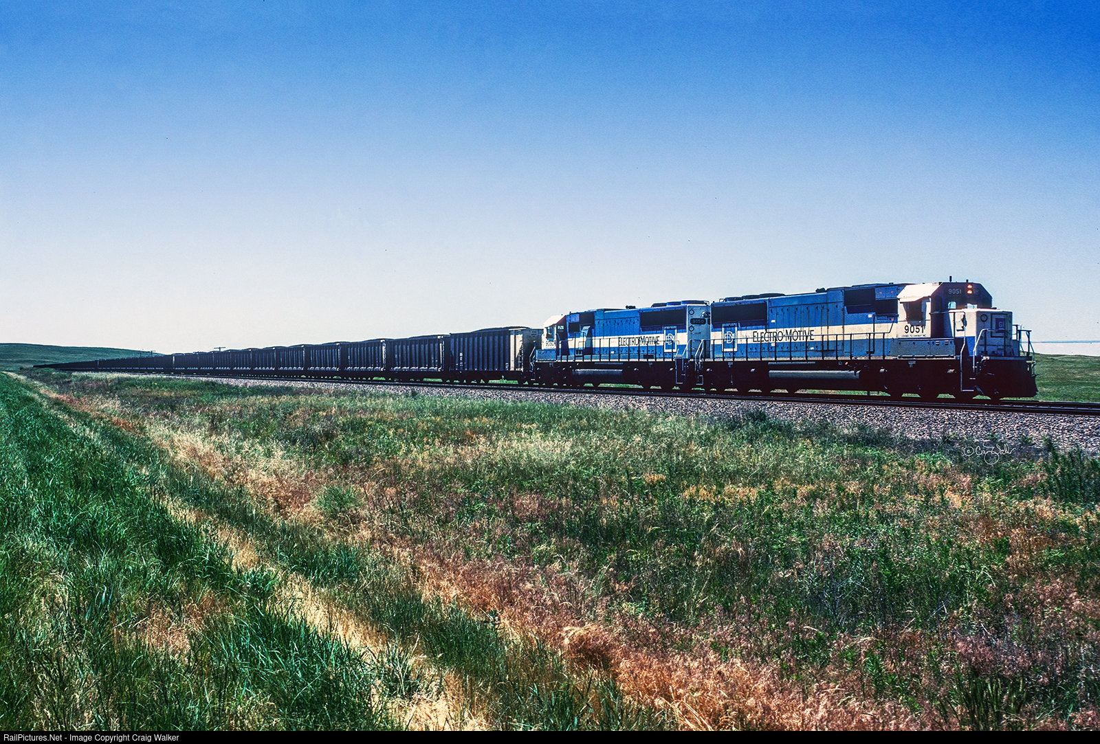 A pair of these, in consecutive numbers (OWY 9051 and 9050) pull a loaded coal train through Nebraska's rolling Sand Hills on a bright summer day. (Antioch, Nebraska – July 8, 1995)