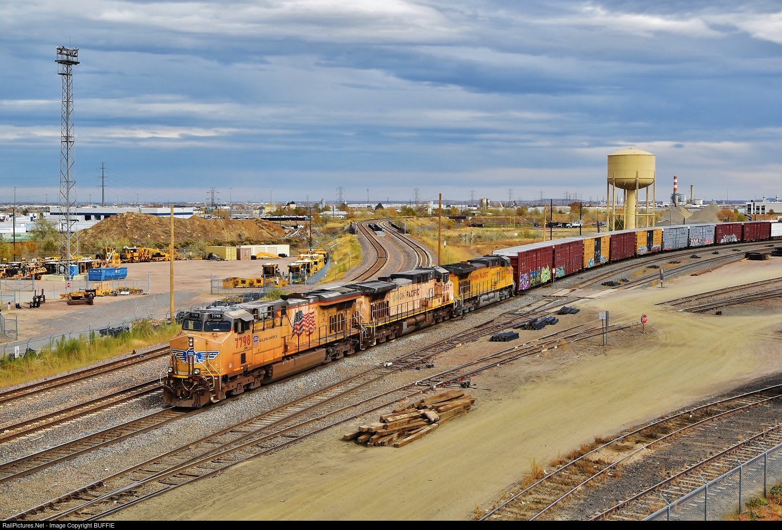 | UP 7798 (ES44AC) leads a freight through the North Yard in Denver, Colorado, passing the old Colorado & Southern water tower.