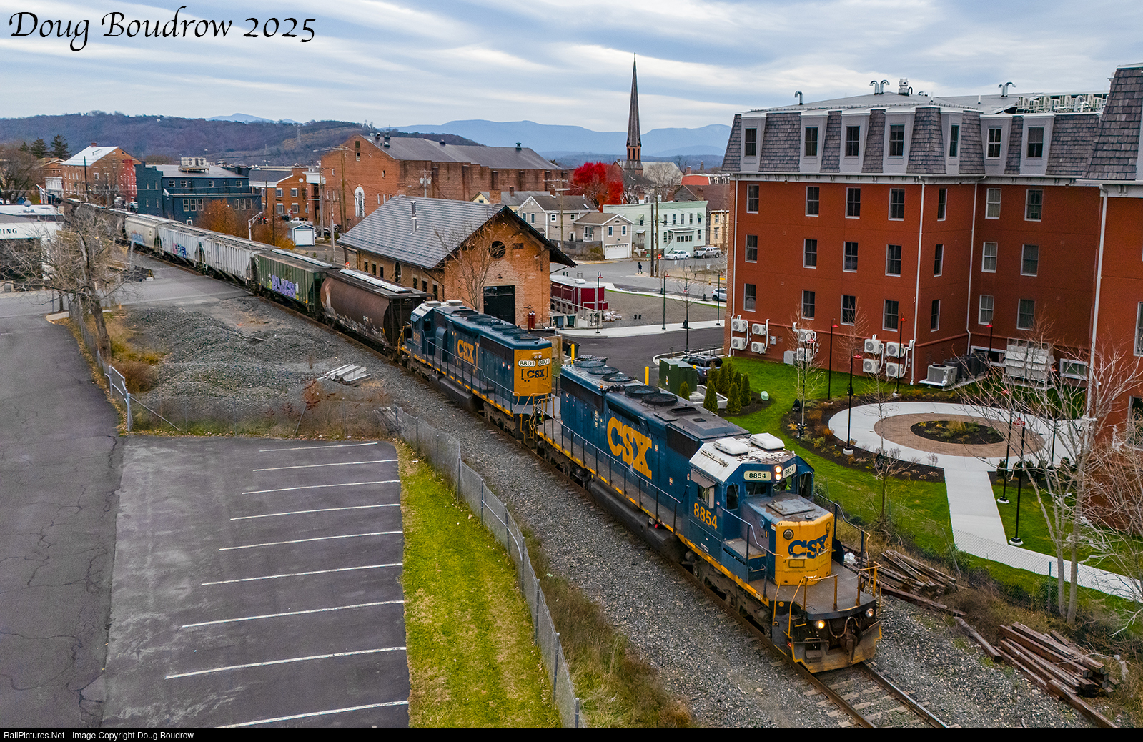 | CSX Local L022 is seen heading to ADM Milling with 8 loads. The crew has split the train in half to get the cuts up the steep grade through town without stalling on the three percent grade. The train is passing the former depot now home to Upper Hudson Brewing. |