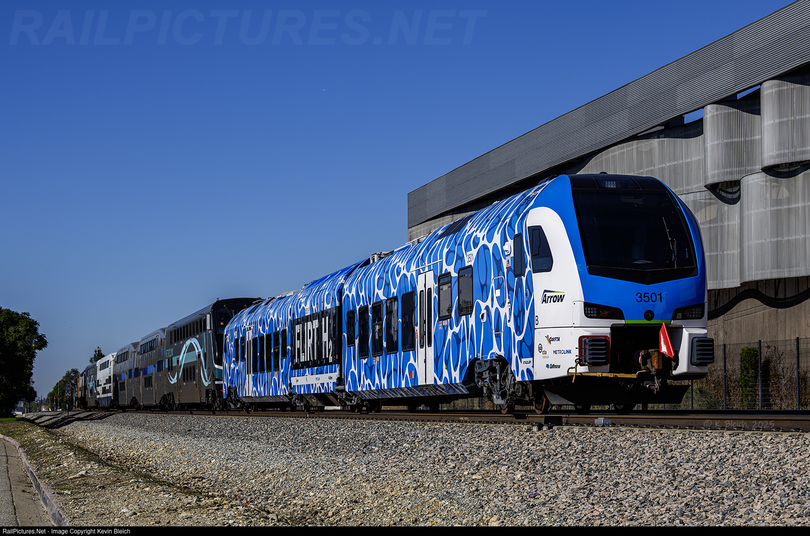 In a rare tow move, the first hydrogen-powered train in the US (a Stadler FLIRT H2) is tacked onto the back of a Metrolink trainset to be moved from San Bernardino to Los Angeles. The ZEMU (Zero Emissions Multiple Unit), which typically runs on the 9-mile Metrolink Arrow route between San Bernardino to Redlands, is being taken to Metrolink's Central Maintenance Facility for some maintenance work before being returned to its home in San Bernardino.