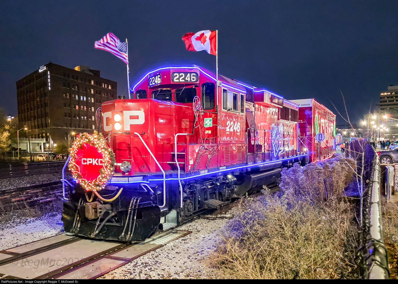 CP 2246 leads the US CPKC Holiday Train at Union Station in Kansas City, MO.