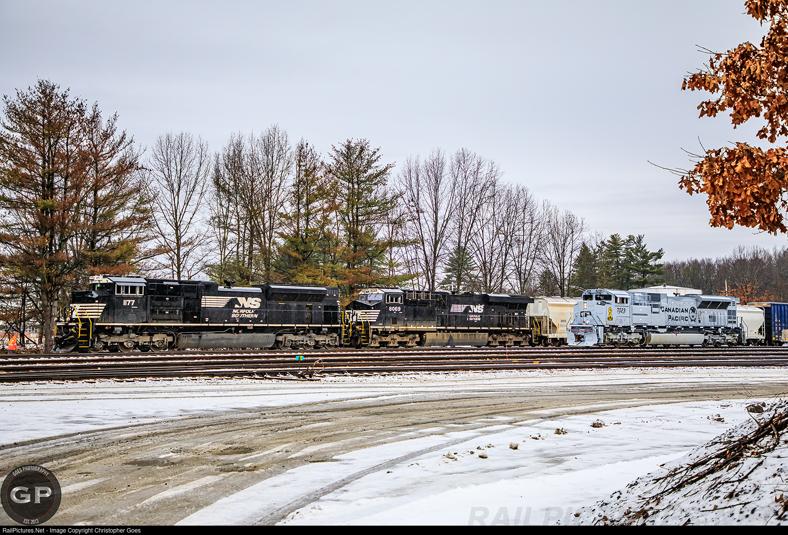 NS 1177 leads the 930 after tying onto a cut of cars while Canadian Pacific "Honoring Air Force" unit CP 7023 reverses back to the shop in Saratoga ending its inaugural trip to the states back in 2019.