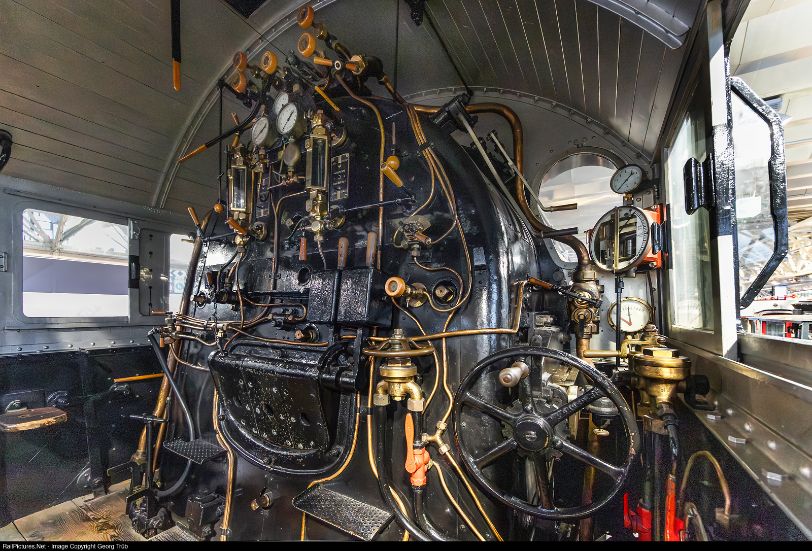 In the cab of four-cylinder compound freight train steam locomotive C 5/6 # 2965, built in 1915 by SLM for the SBB, owned and exhibited at the Swiss Museum of Transport in Lucerne (VHS). The locomotive was exhibited in front of the depot in Erstfeld from 1970 to 1982 and then moved to the VHS. From 2001 to 2024, the locomotive was owned by SBB Historic, and since then, following a vehicle exchange, it has belonged to the Swiss Museum of Transport (VHS)