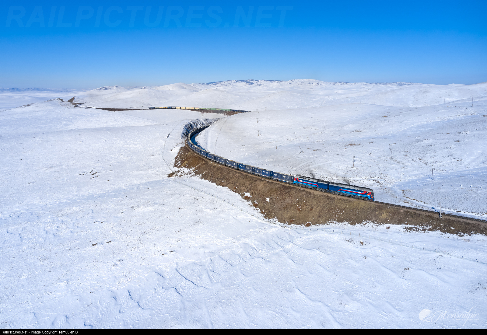 A 2TE25KM leading with a 2TE116UM helper pushes a 6,800-ton mixed train of coal, iron ore, and timber claws the grades of Khoolt Pass. Captured by a Mavic 2 Pro drone at -15C, at one of the highest points of the Trans-Mongolian Railway, around 1650-1700m asl. Inquire tours: monrailpic@gmail.com