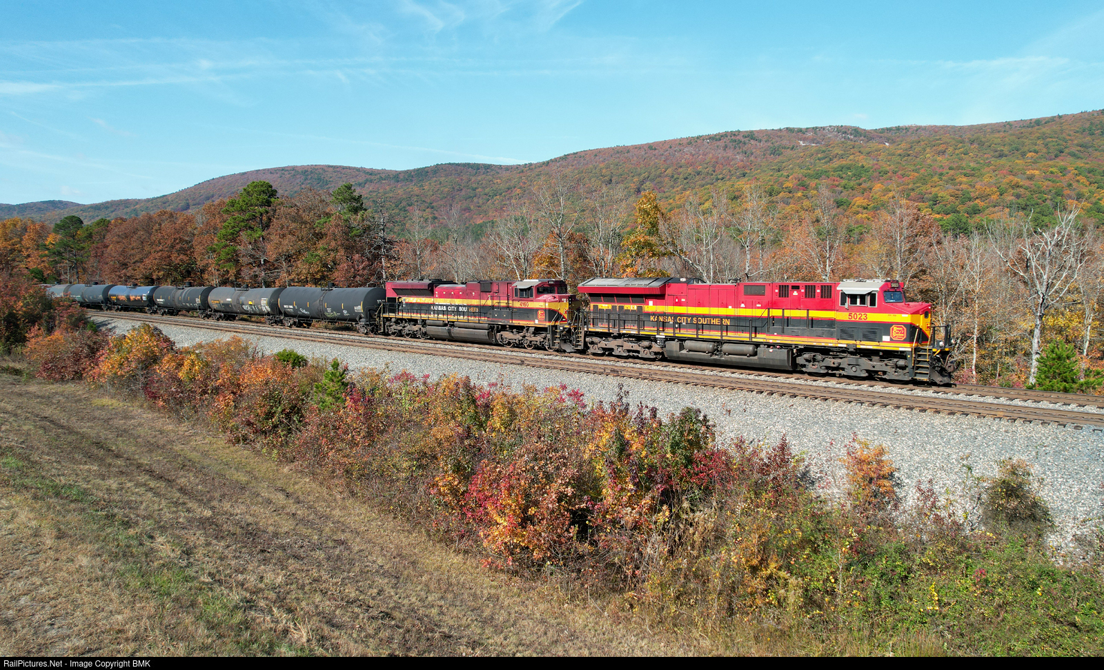 Its a beautiful fall day in the Ouachita Mountains as KCS 5023 leads a loaded oil train through Rich Mountain Arkansas.