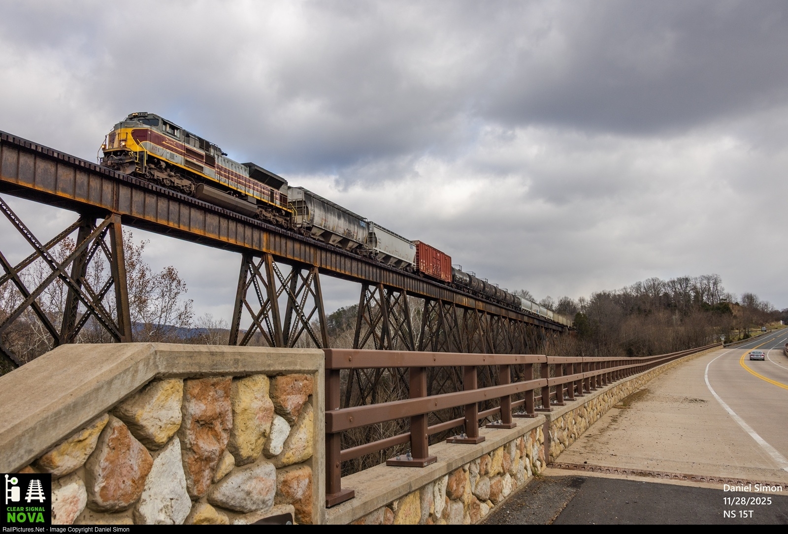 | NS 1074, the Lackawanna Heritage Unit, brings NS Train 15T over the Compton Trestle following its recent repaint. |