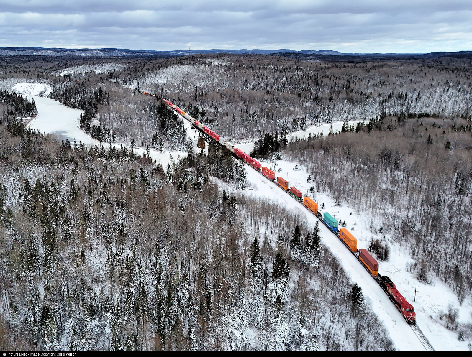 Train 101 crosses the trestle over the Pic River with a new CPKC locomotive on the point.