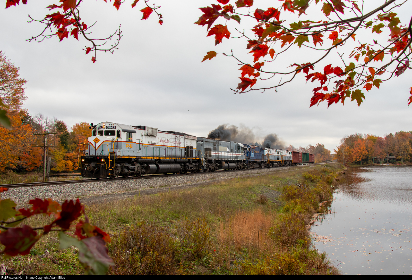 | The last Alco C636 in operation leads the PO75 job back towards Scranton, PA after making a run down to Bestway Enterprises in Cresco. Here they are passing by the popular Larsen Lake shot in Gouldsboro. |