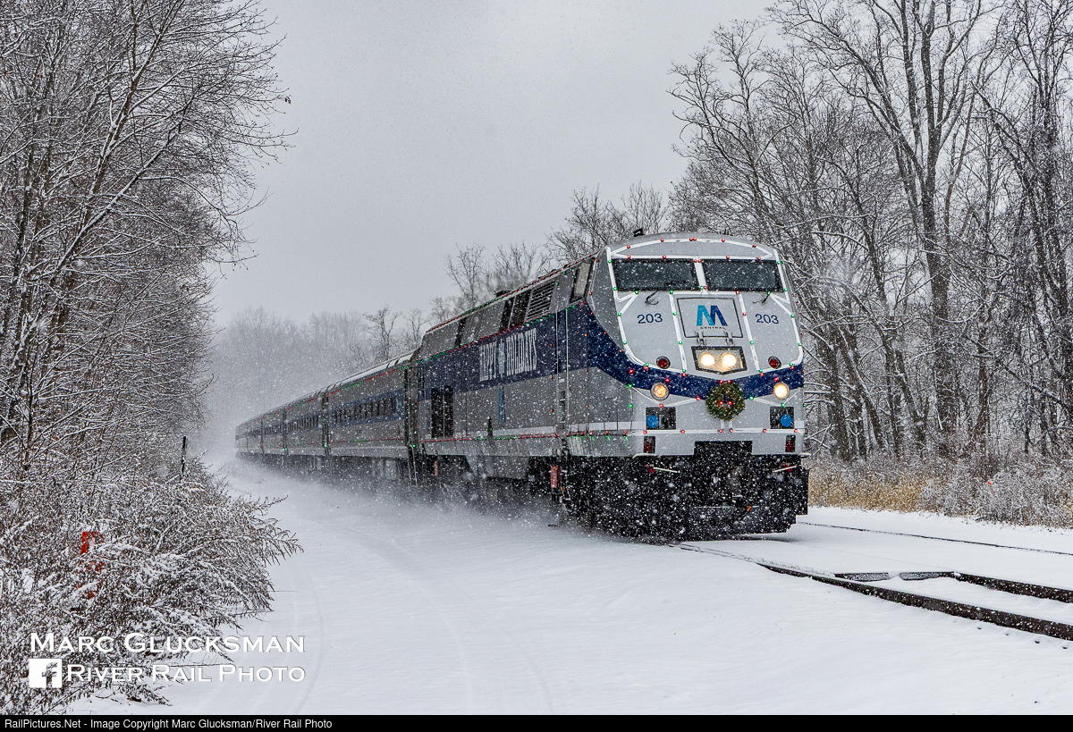 Snow For The Holiday Lights Train. On Tuesday, December 2, 2025, the MTA Metro-North Railroad Train with MNCW 203 (M-Central Heritage) met snow for the first time. Both this train and an 8-car set of M8 electric MUs will operate in revenue service on the Hudson, Harlem, and New Haven Lines for the next month. The train is passing through Garrison, New York during the first snow of the season.