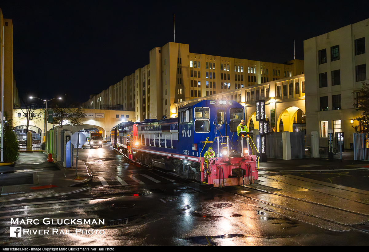 Early Start To The Day. On November 8, 2025, NYNJ Rail headed north on 1 Avenue in Brooklyn, New York, before sunrise. The pair of Knoxville Locomotive Works (KLW) SE10Bs are seen passing through the gate of the Brooklyn Army Terminal, once a military installation, but now a home for civilian light industry. NYNJ Rail is the only railroad in New York City that runs on a public street.
