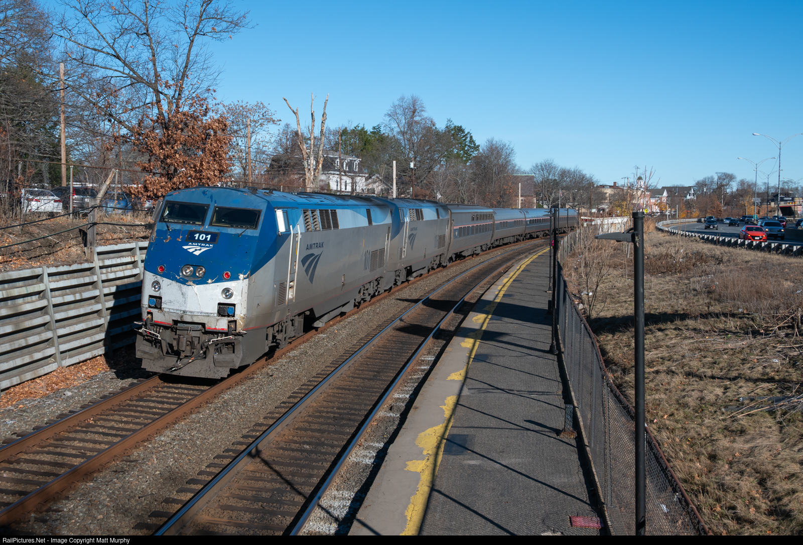 Rail vs Lobbied Transportation - On the Monday before Thanksgiving of 2024, the midday Lakeshore Limited is seen blasting through Auburndale Station at Newton, MA, en route to Albany, NY. This stretch of track along the MBTA's Framingham Line, from Boston out to this spot, runs parallel to the Mass Pike.