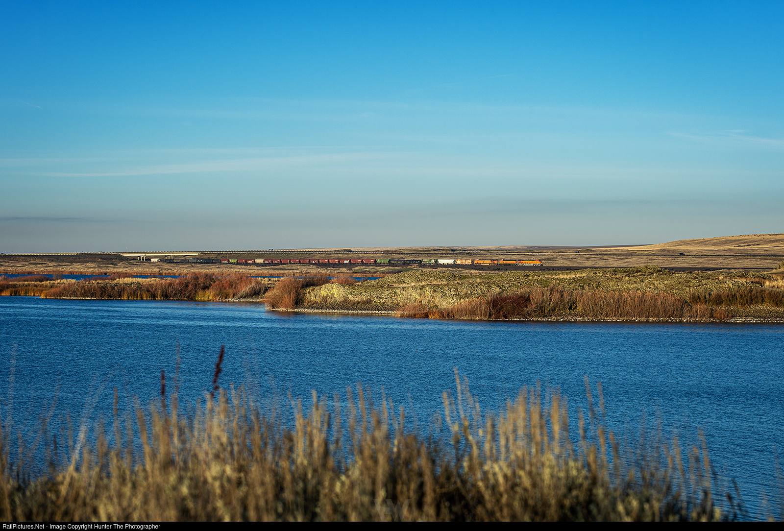 | Heading east along BNSF's Lakeside Subdivision, a manifest train passes by Sprague Lake near Pifer, WA on the cool morning of Sunday, December 1, 2025.