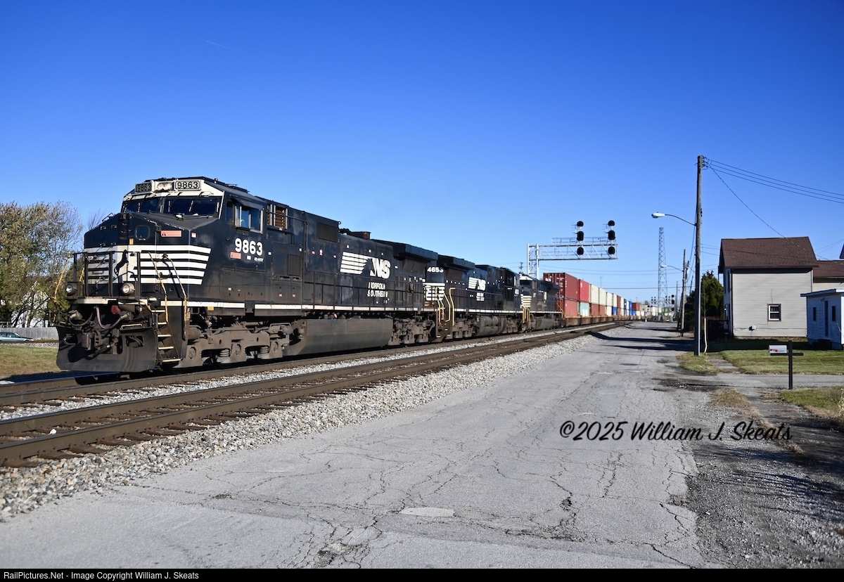 | Westbound Norfolk Southern stack train switching from Main 1 to Main 2 at CP Mini Plant. Heading through E. Center Street along through S. Buckeye Street in Bellevue, Ohio. NS D9-44CW 9863, AC44C6M 4653, SD70ACe 1077 on the Sandusky District will head through Southwest St. CP onto the Fostoria District. |