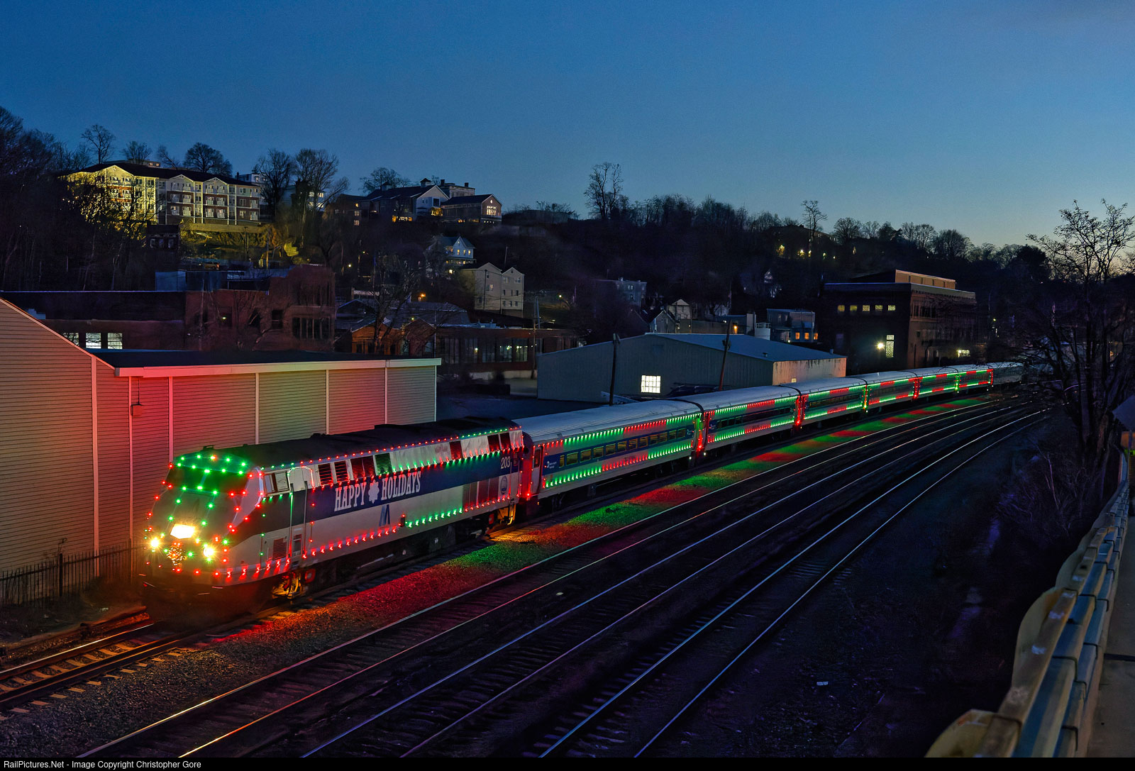 Metro-North's Holiday Lights Train going to Croton-Harmon just after sunset.