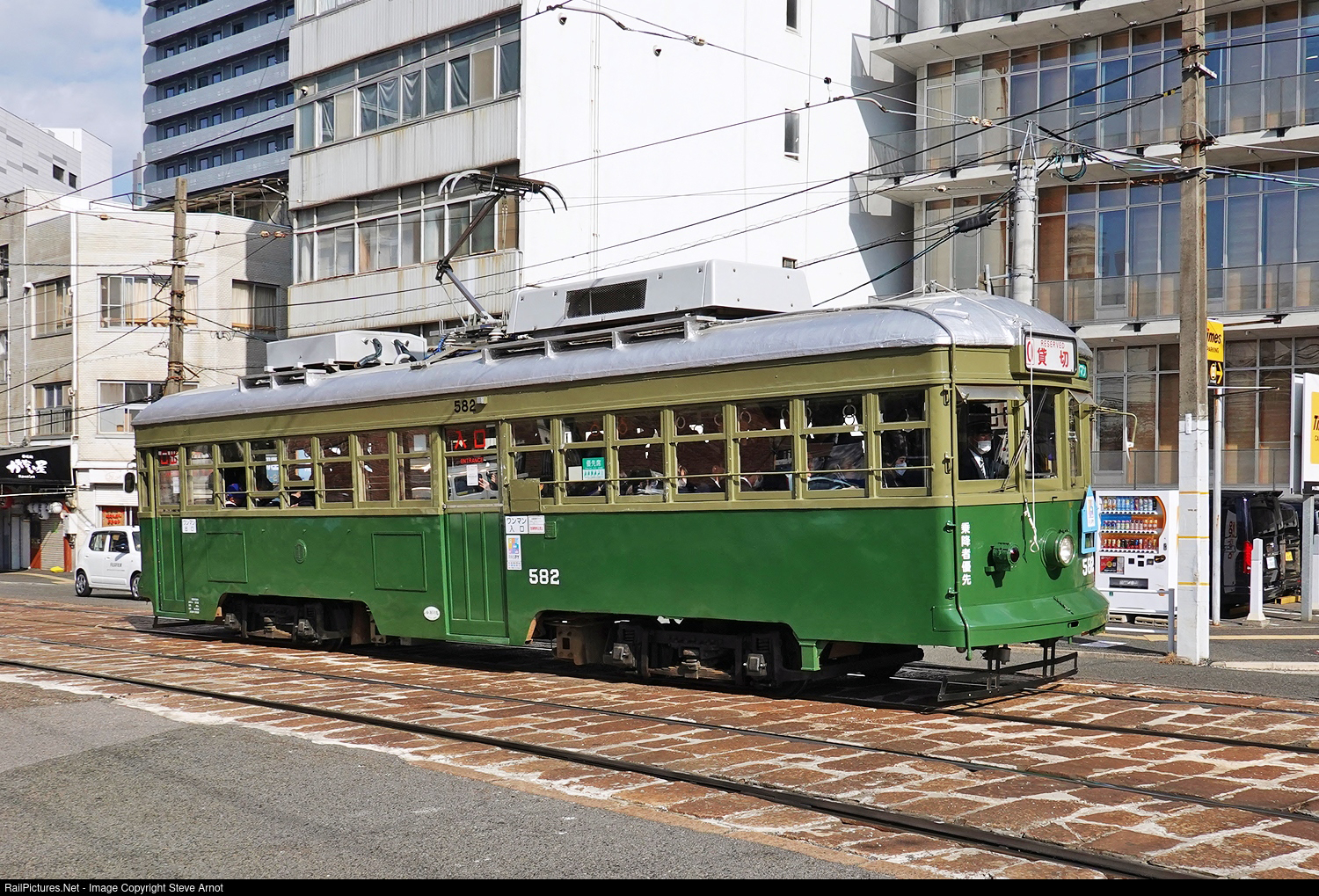 Hiroshima Electric Railway former Kobe Municipal Transportation Bureau 500 series car 582 heads south on Ekimae-dori Ave. This car is the last active unit of a group of 22 trams that were built in 1955 and acquired from the Kobe tram system when it shut down in 1971.
