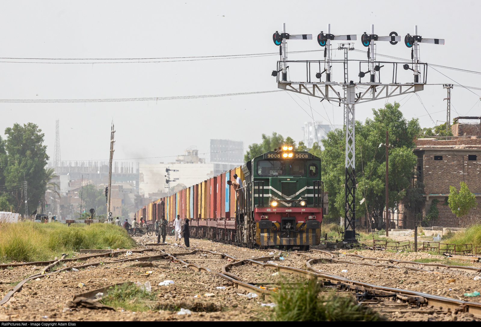 | A Northbound container train from Karachi is seen here coming into Hyderabad Junction passing by the British Colonial semaphores. These semaphores went up somewhere around the 20th century, from what I can find. This container train is traversing North to Lahore.