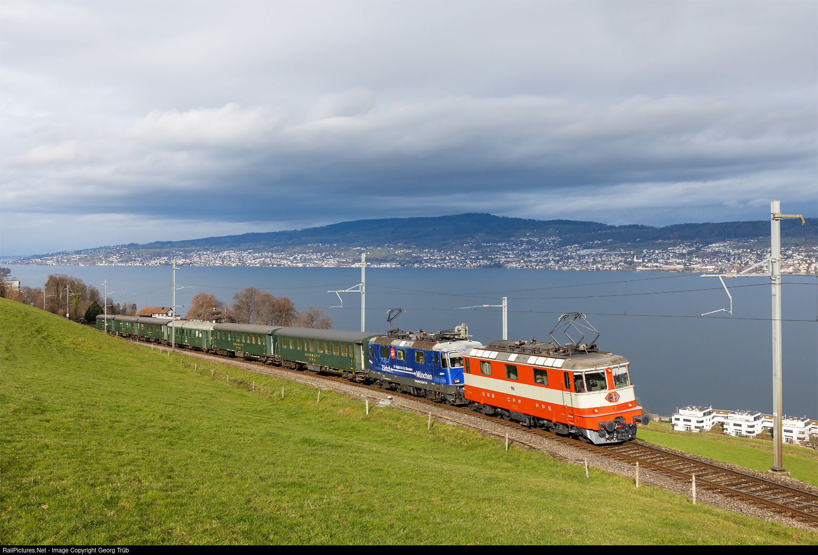 On St. Nicholas Day, the Full Steam Locomotive Depot Association (DDF) organized a special train from Koblenz via Laufenburg-Stein-Säckingen-Brugg-Zürich Altstetten-Thalwil-Wädenswil to the Christmas market in Einsiedeln, using its own former SBB locomotive Re 421 # 379 (with advertising stickers for 3 1/2 hours Zurich-Munich), the 5 former SBB/Eurovapor cars AB # 3664, # 3663, # 3658, # 3662, and # 3660, and the DSF's buffet car BRz # 50 81 85-35 302-8. As it was discovered that only three traction motors on the Re 421 were still operational and therefore did not provide sufficient pulling power for the steep 5.0 % gradient from Wädenswil up to Biberbrugg, the Re 4/4 II # 11141 in the “Swiss-Express” paint scheme from the Koblenz Depot and Rail Vehicles association (DSF) was sent on short notice after the special train 31246. The locomotive train 38005 reached Wädenswil immediately behind the special train, after a journey time of only 44 minutes from Koblenz. In Wädenswil, locomotive # 11141 was coupled to Re 421 # 379 and the multiple control system was set up. The train under the Oensingen-Balsthal-Bahn railway is on its way to Samstagern-Biberbrugg-Einsiedeln above Lake Zurich near Burghalden. The destination Einsiedeln was reached with 5 minutes delay only.