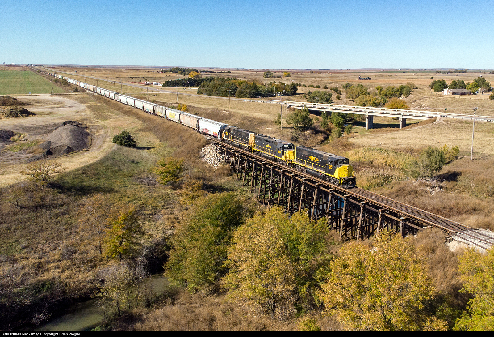 A 40+ car Kansas & Oklahoma grain train rolls over North Fork Walnut Creek with a hi-rail following the train.