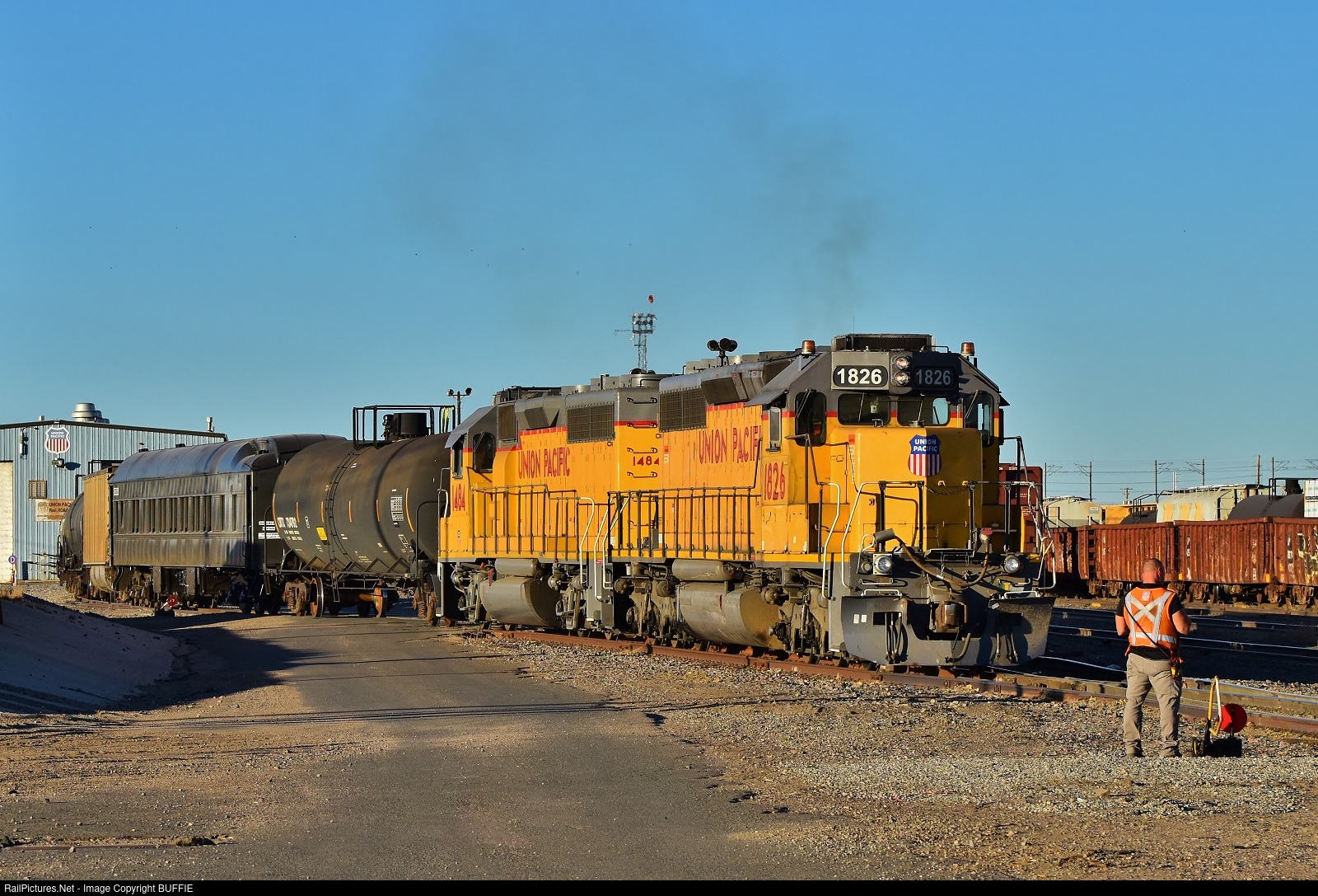 | The remote-control engineer pulls UP 1825 (SD40N) up to the switch in the North Yard in Denver, Colorado.