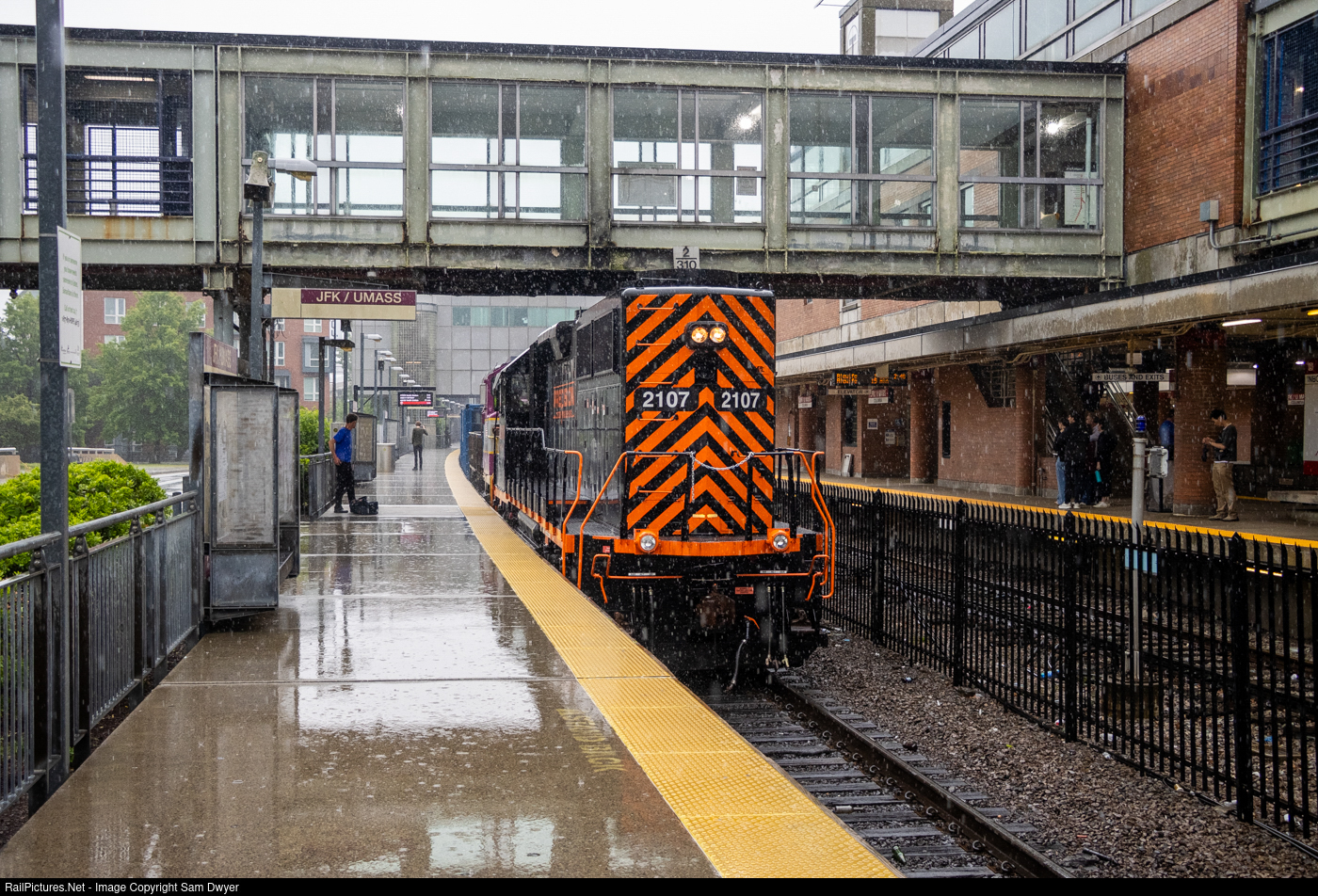 With mere minutes before its crew outlawed, the Middleboro Extra rolls through JFK/UMass with PNLX 2107, one of two Precision Locomotive Leasers on MBTA's fleet. In trail is an eclectic mix of MassDOT hoppers, MBTA Side Dumps, an HSP46, and a GP40MC.