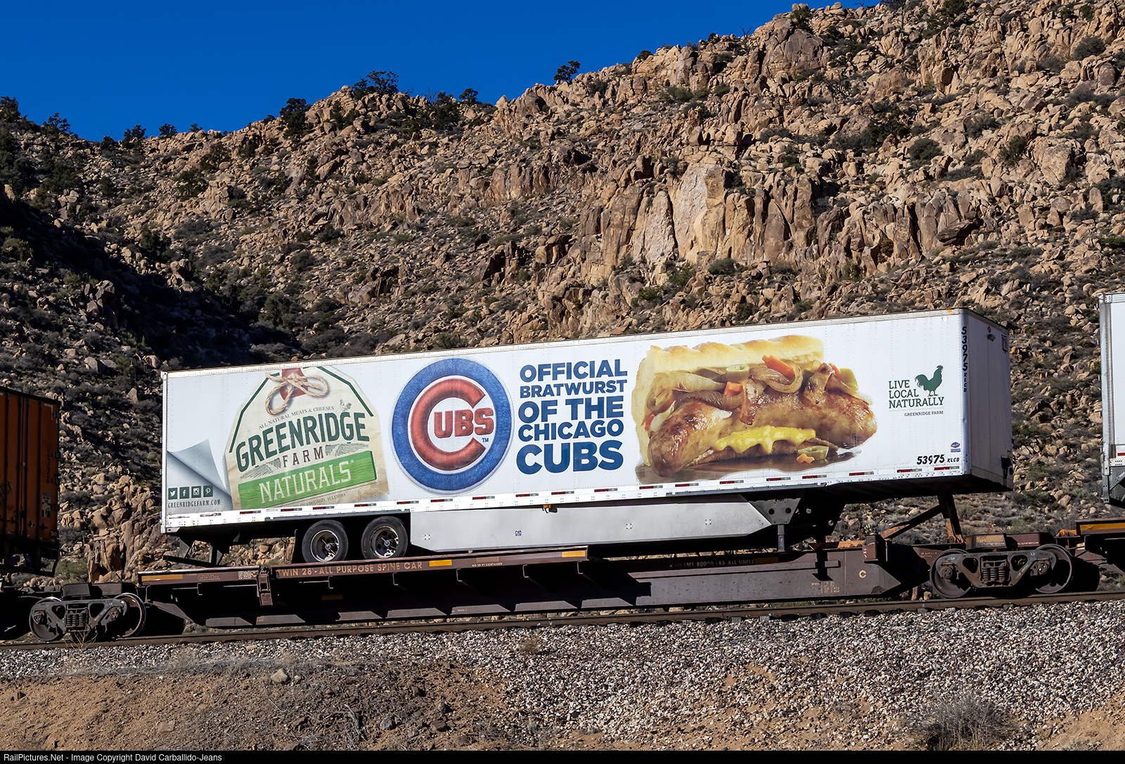 A Greenridge Farm Naturals' trailer, sporting the Chicago Cubs logo, is being towed on the back of the 9,000 foot-long San Bernardino, CA to Willow Springs, IL Z8 train. While a high priority intermodal train, the Z-SBDWSP8 is slowly crawling through the area of Crozier Canyon as it follows a slow moving eastbound stack train. With the lack of UPS on this train, the train will keep following the slower train across the subdivision.