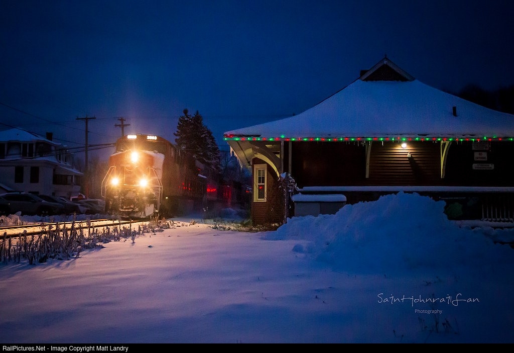 CN 594 through Hampton, New Brunswick passing the lit up tourist bureau.