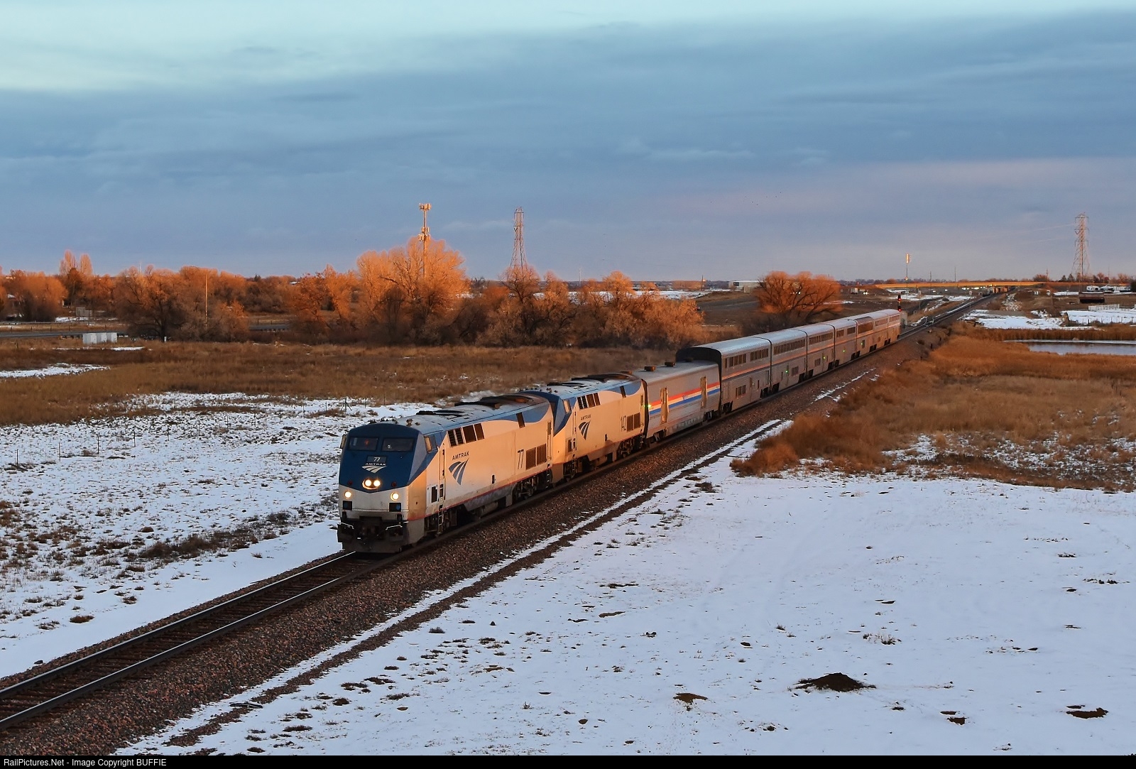 | The California Zephyr runs west on the Brush Sub through Tonville, Colorado at sunrise as it heads to Denver's Union Station.