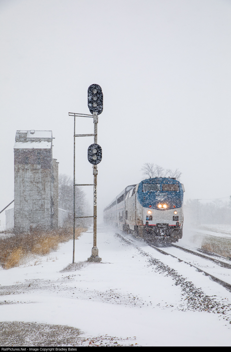 | Amtrak's City of New Orleans #58 roars north through Hayes, IL. during the first snowstorm of the season across the Midwest. |