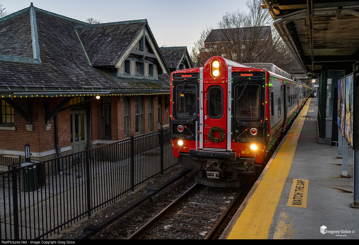 As the sun rises on November 28th, 2025, Metro-North Railroad’s “Holiday Lights Train” (running on train 9605) passes the former NYC station house while making its stop at Bedford Hills, New York, on the Harlem Line. The Holiday Lights Train is a specially decorated, 8-car Kawasaki M8 consist operating on all electrified portions of the Harlem, New Haven, and Hudson Lines throughout the remainder of the holiday season.