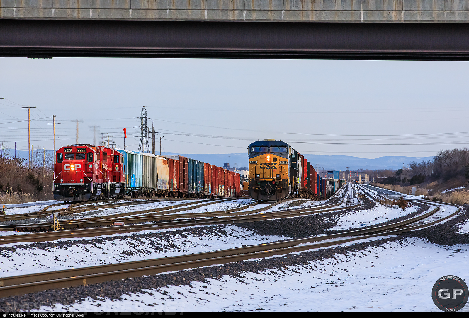 | CPKC G42 crew out of Kenwood in the Port of Albany acting as G323 lead by CP 2228 & CP 2318 backs down into Track 2 as the M409 lead by CSX 5415 rolled up on Track 10 behind them to "cut-away and talk" as the sun fell behind the Helderbergs closing out another cold December day in Upstate NY. |