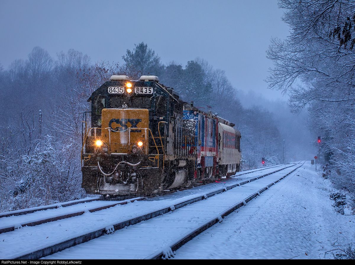 A rare FRA inspection train rolls eastbound along the Buckingham Branch, led by CSXT 8435 an SD40-2. Seen here, the train rolls into the siding as it prepares to meet a westbound empty coal train ahead. |
