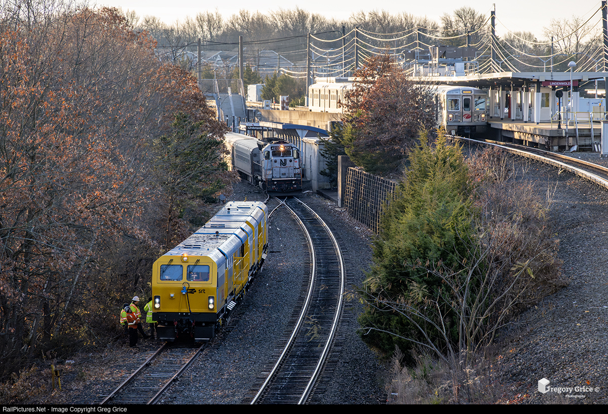 On the morning of December 1st, 2025, Delta Railroad Services' SRT (Smart Railway Technology) Vulcano LGT 32M Rail Grinder sits at the PATCO siding as NJ Transit Train 4612 and a PATCO train, both bound for Philadelphia, prepare to depart the station at Lindenwold, New Jersey on the Atlantic City Line. The rail grinder had previously finished work on PATCO's system and was beginning its new assignment grinding the rails along the Atlantic City Line.