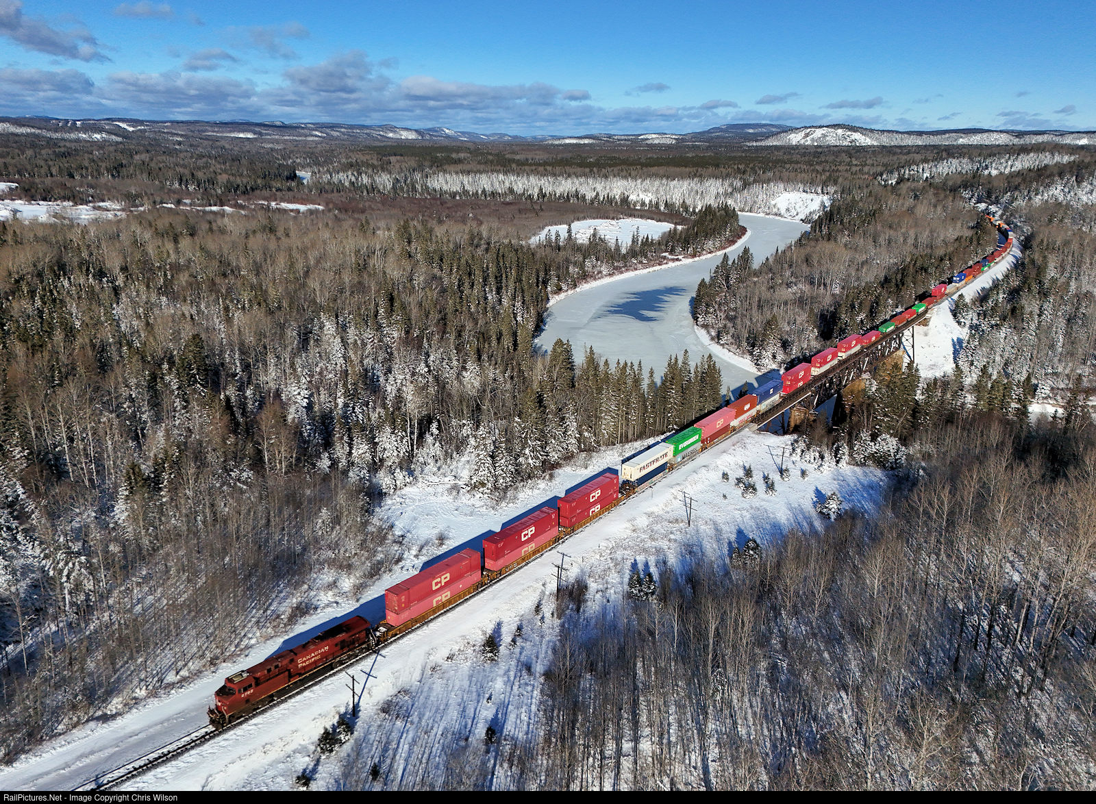 | CPKC train 119 from Montreal to Edmonton eases into Heron Bay crossing the trestle over the Pic River. CP ES44AC 8792 is teamed up with KCSM SD70ACe 4096 operating DP 1x1x0 with just 7300ft of stacks today. |