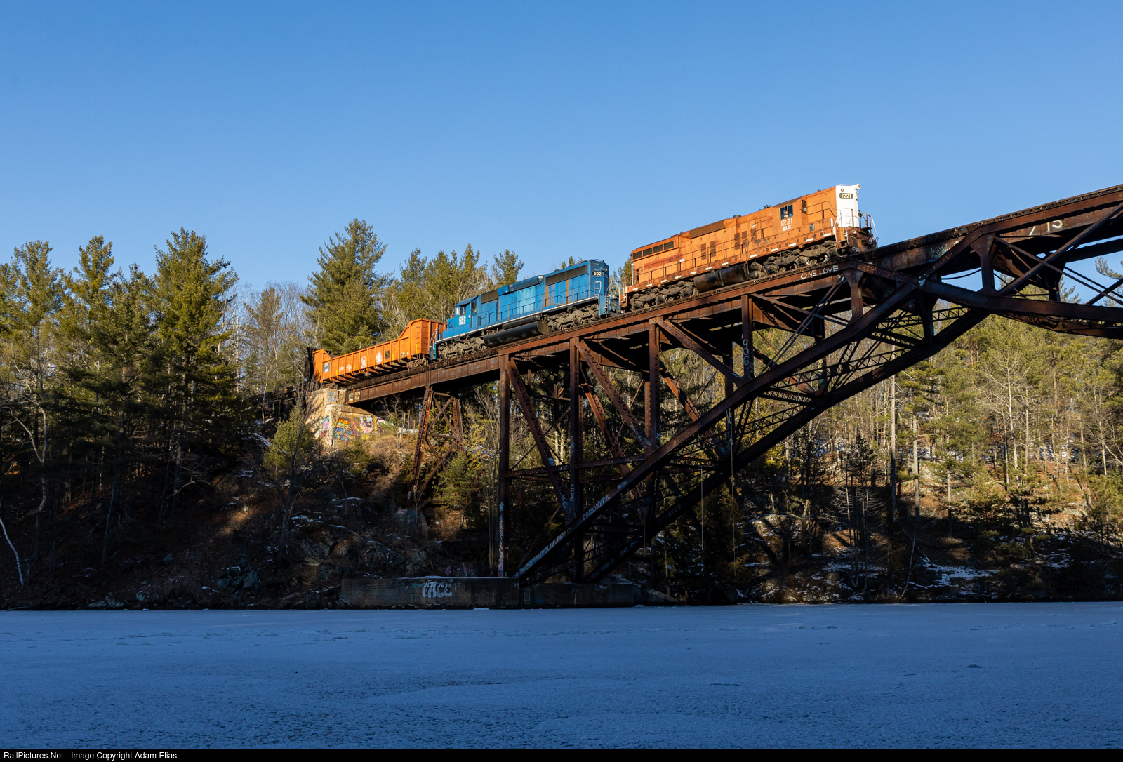 | ELS creeping across the Menominee River at the border of the states of Michigan and Wisconsin. Unfortunately, shadows had taken over the remainder of this super nice bridge. |