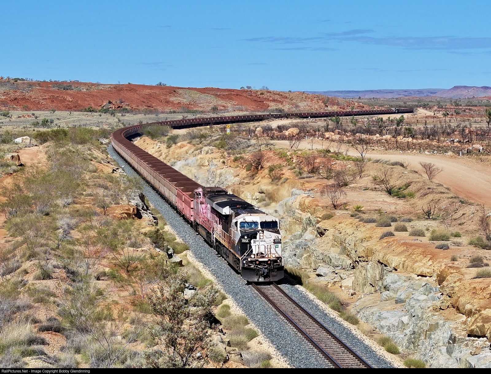 | Roy Hill ES44ACi locomotives haul 240 iron ore loads down the 1% grade near 184km, just about halfway between the loadout at Marble Bar and the dumper west of Port Hedland, Western Australia. |