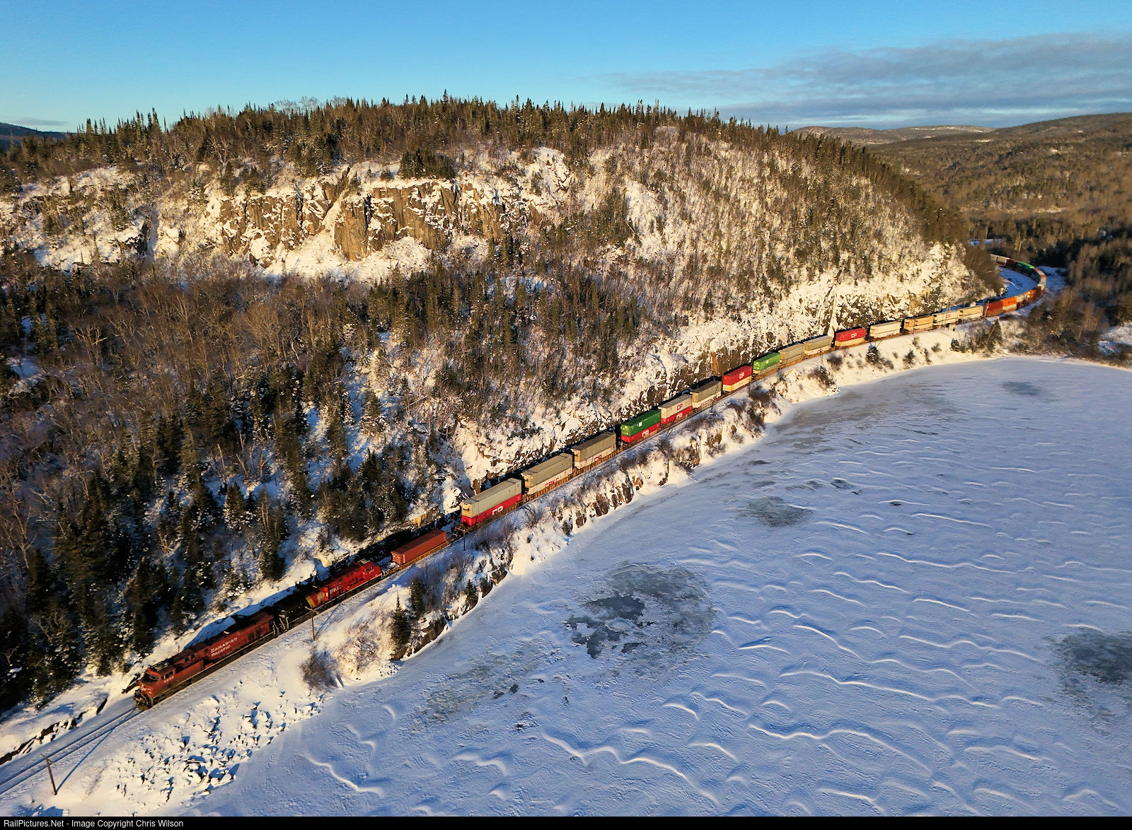 CPKC's Edmonton, AB to Montreal, PQ intermodal train 118 heads east out of Coldwell, Ontario along frozen Echo Lake. CP ES44AC 8833 + KCS ES44AC 4805 have just over 12,000ft of intermodal traffic with another locomotive (CP 8877) operating DP mid train.