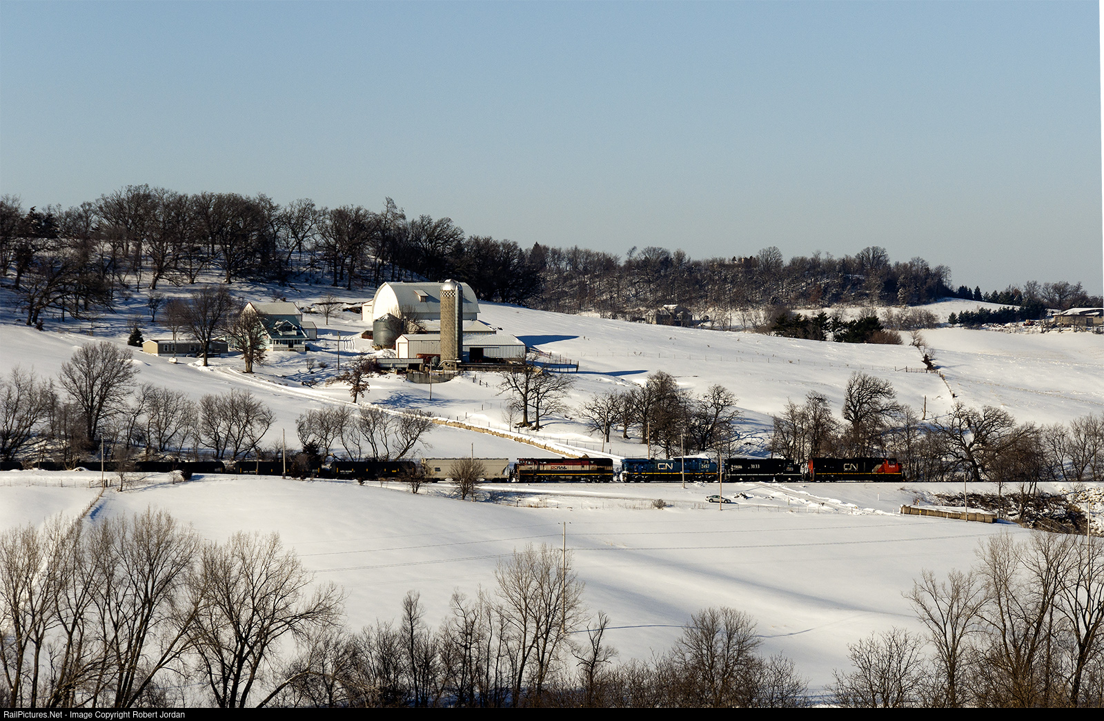 | Canadian National eastbound ethanol train is down grade near Dubuque, Iowa on February 10th 2010.