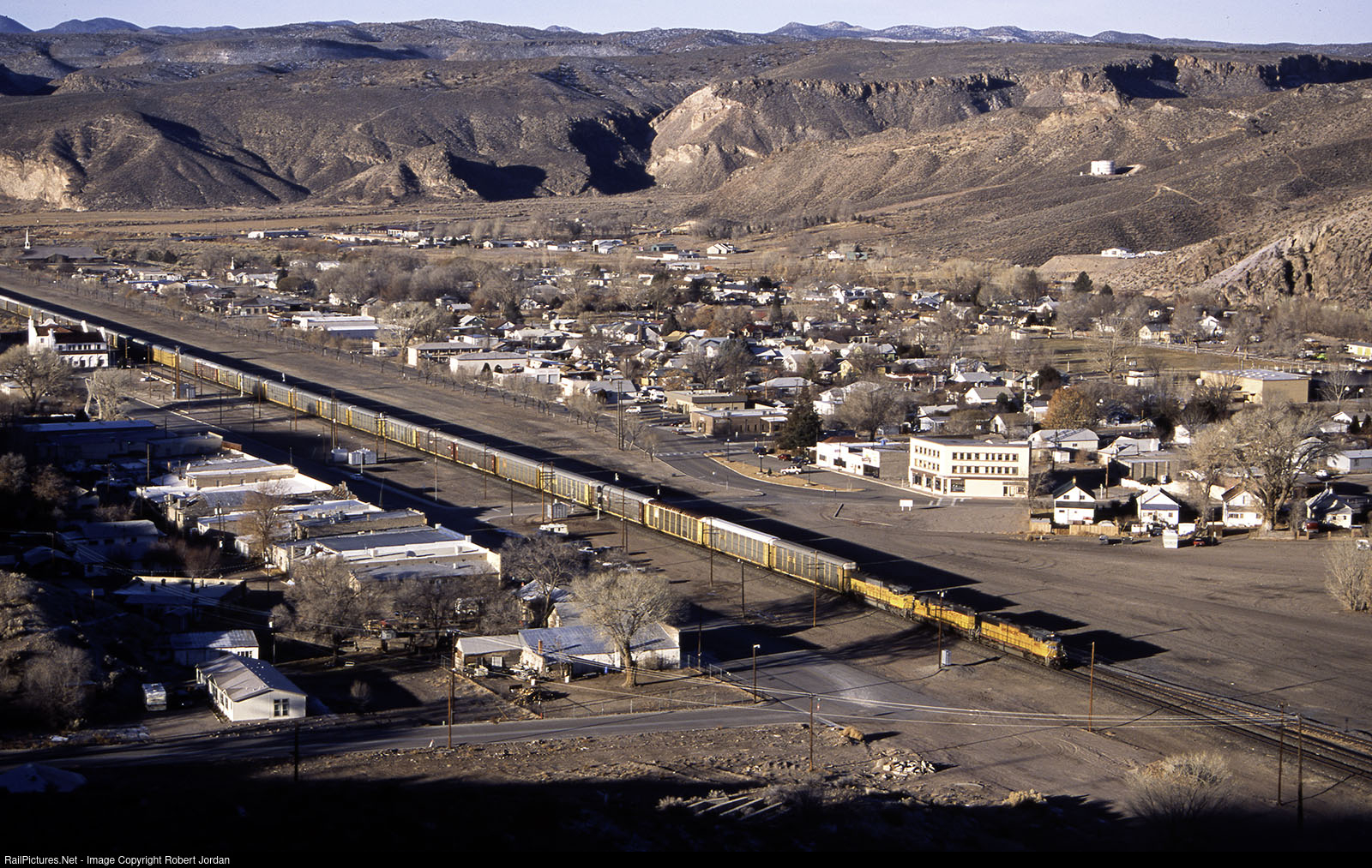 Early in the morning, December 18, 2003, an eastbound auto rack train slices through the middle of Caliente, Nevada. The old business district and the Mission Style railroad station, now the Village hall, is to the left and the residential section and new highway to the right. Caliente sits at north end of Rainbow Canyon, the site of many disastrous floods from the early 1900’s through 2005. At one time Caliente was a division point, crew change and steam maintenance center.e