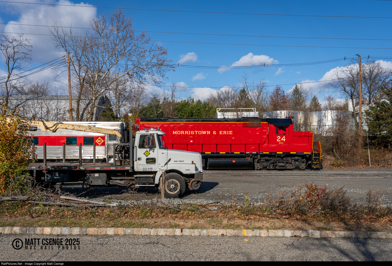 Morristown & Erie Railway (ME) GP15-1 no. 24 leads the Whippany Polar Express (train 1330) east along the Whippany Branch. Parked trackside is one of the railroad's hi-rail maintenance trucks, which still sports the logo of the former Maine Eastern Railroad (MERR), which was a ME subsidiary that operated from 2003-2015. |