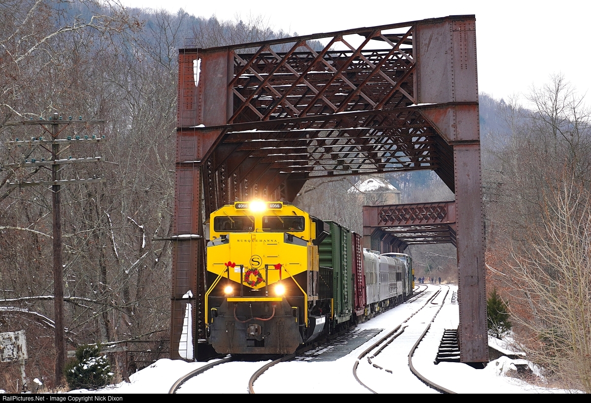 The Susquehanna crossing the Susquehanna at Susquehanna. New York, Susquehanna & Western #4066 crosses the Susquehanna River just to the west of the Erie depot at Susquehanna, PA with a rare daylight move over the Southern Tier. Just visible between the two bridges is the upper portion of the Erie coaling tower across the river. The #4066 was leading an Operation Toy Train toy collection special east from Binghamton, NY to Shohola, PA, collecting toys to be donated for the holidays.