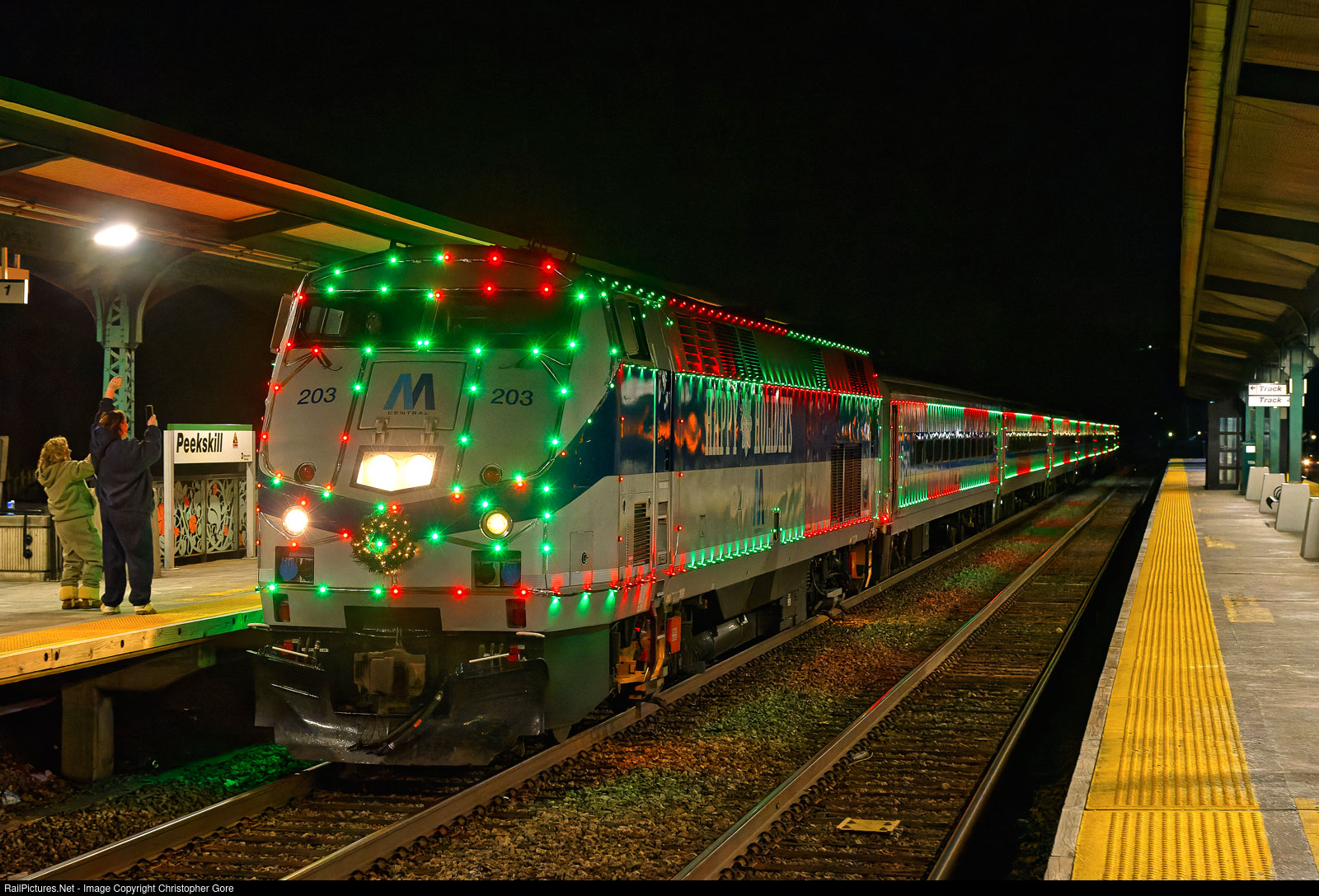 Metro-North's Holiday Lights train pulling into the Peekskill station.