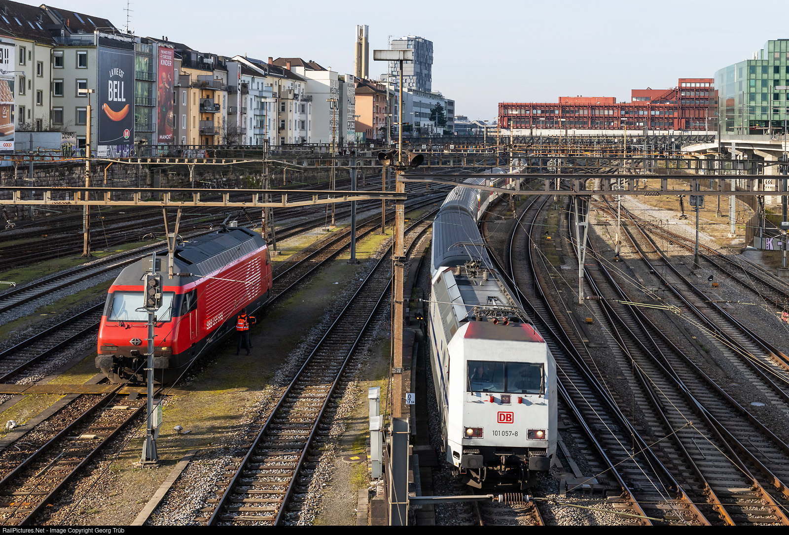 With the timetable change on December 14, 2025, locomotive-hauled trains will no longer run between Switzerland and Germany on the route along the Rhine. On December 12, the Eurocity 8 ran from Zurich via Basel-Mannheim-Cologne-Dortmund-Bremen to Hamburg Altona for the last time. For this day, the train was given the traditional name RHEINGOLD. EC 8 leaves Basel SBB for Hamburg with Deutsche Bahn locomotive 101 # 057, in the special “Lok für Europa” (Locomotive for Europe) livery. On this day, the train had three SBB Apm panorama cars attached as a special replacement for the normal first-class cars. All cars, including the dining car, were from SBB. On the left is SBB's Re 460 # 005, which brought the train from Zurich to Basel SBB.